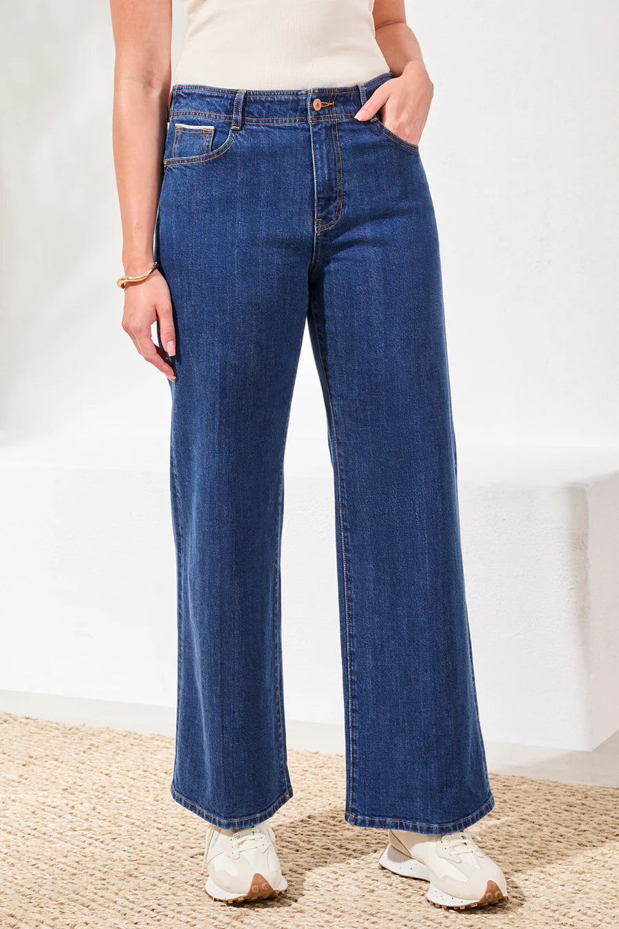 Let these denim trousers flatter your figure with a high rise fit and a sexy back v dip detail at the center of the back waistband. The selvage denim features mechanical stretch, allowing for comfortable and easy movement. A permanent crease detail at the front and back of the wide leg adds poised structure to the look.