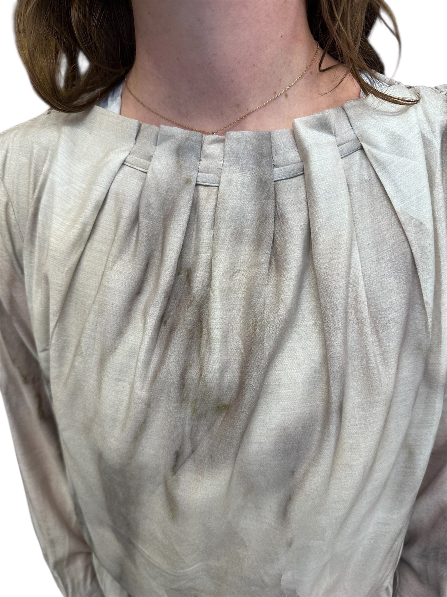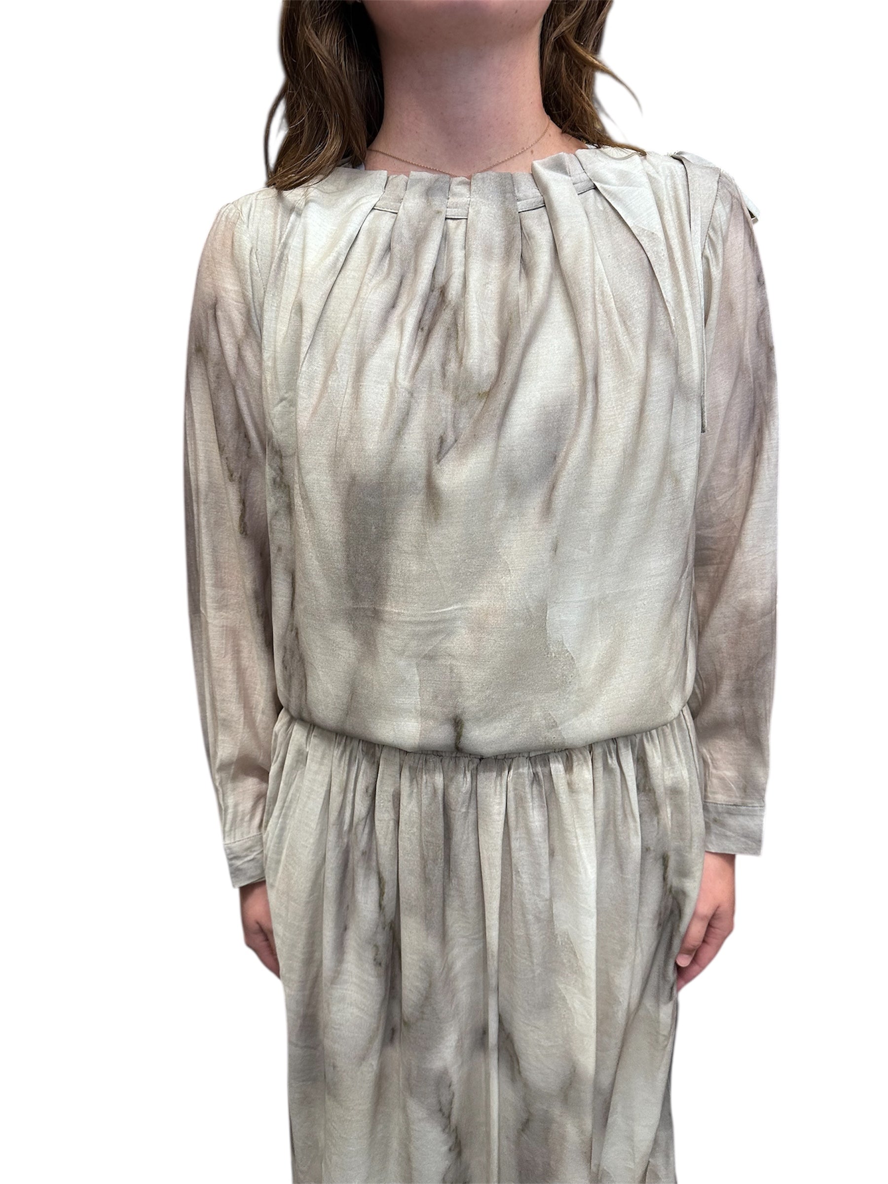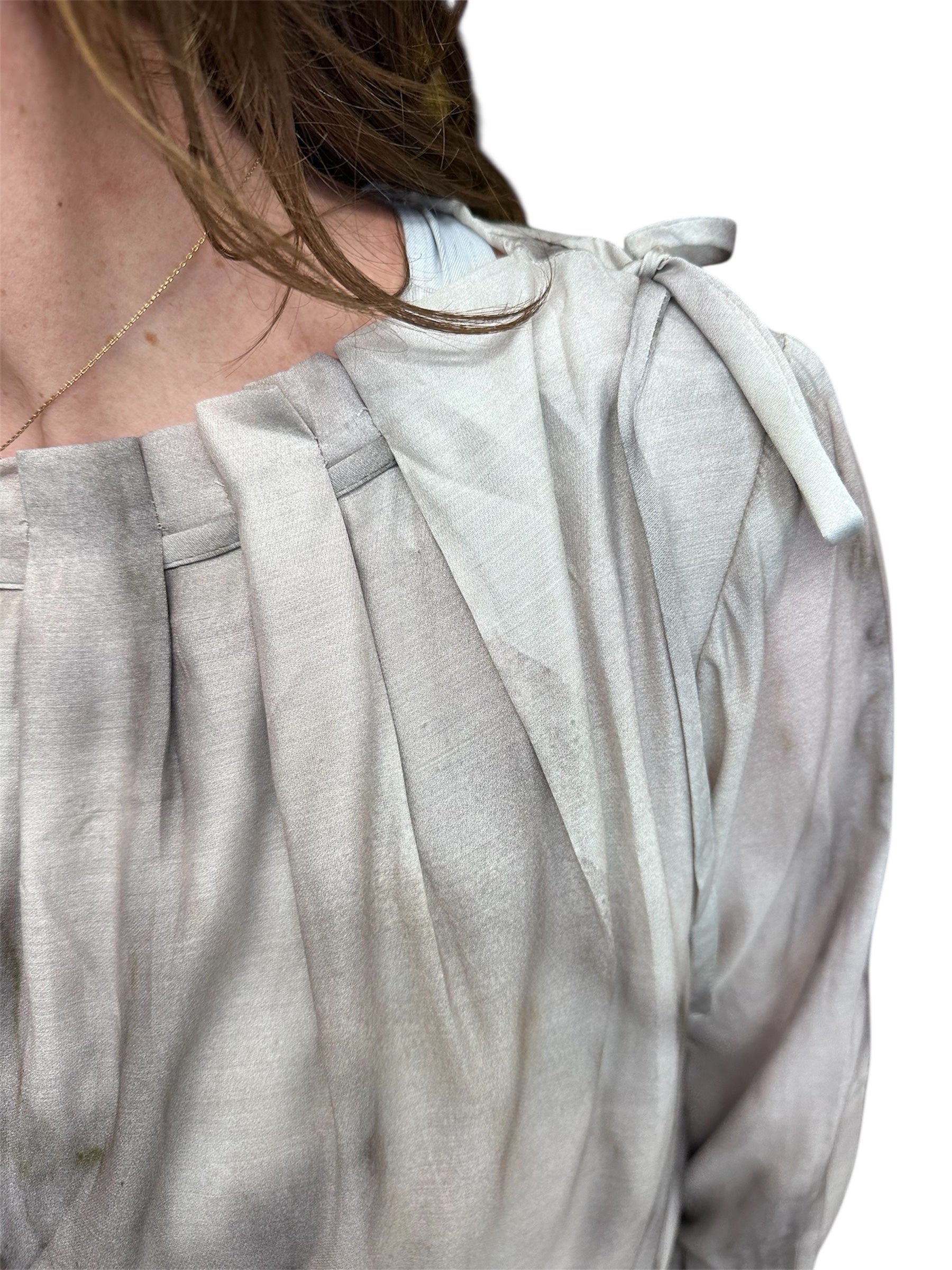 Pleated tie neckline with bubble sleeves and bubble hem.