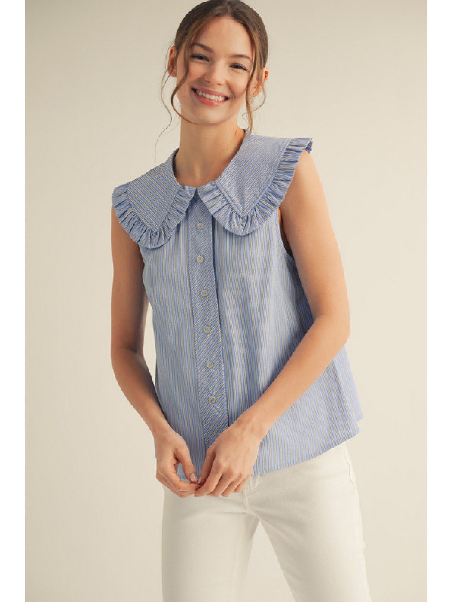 Sleeveless button down stripe top with ruffled wide collar.