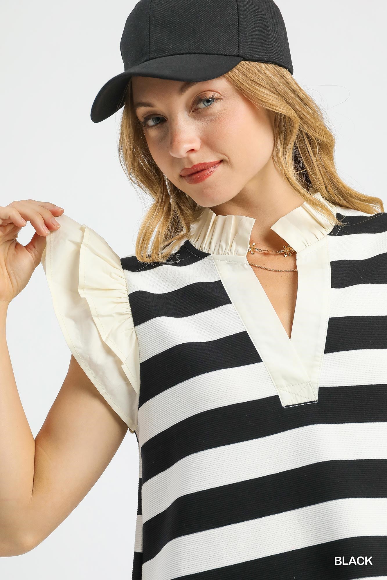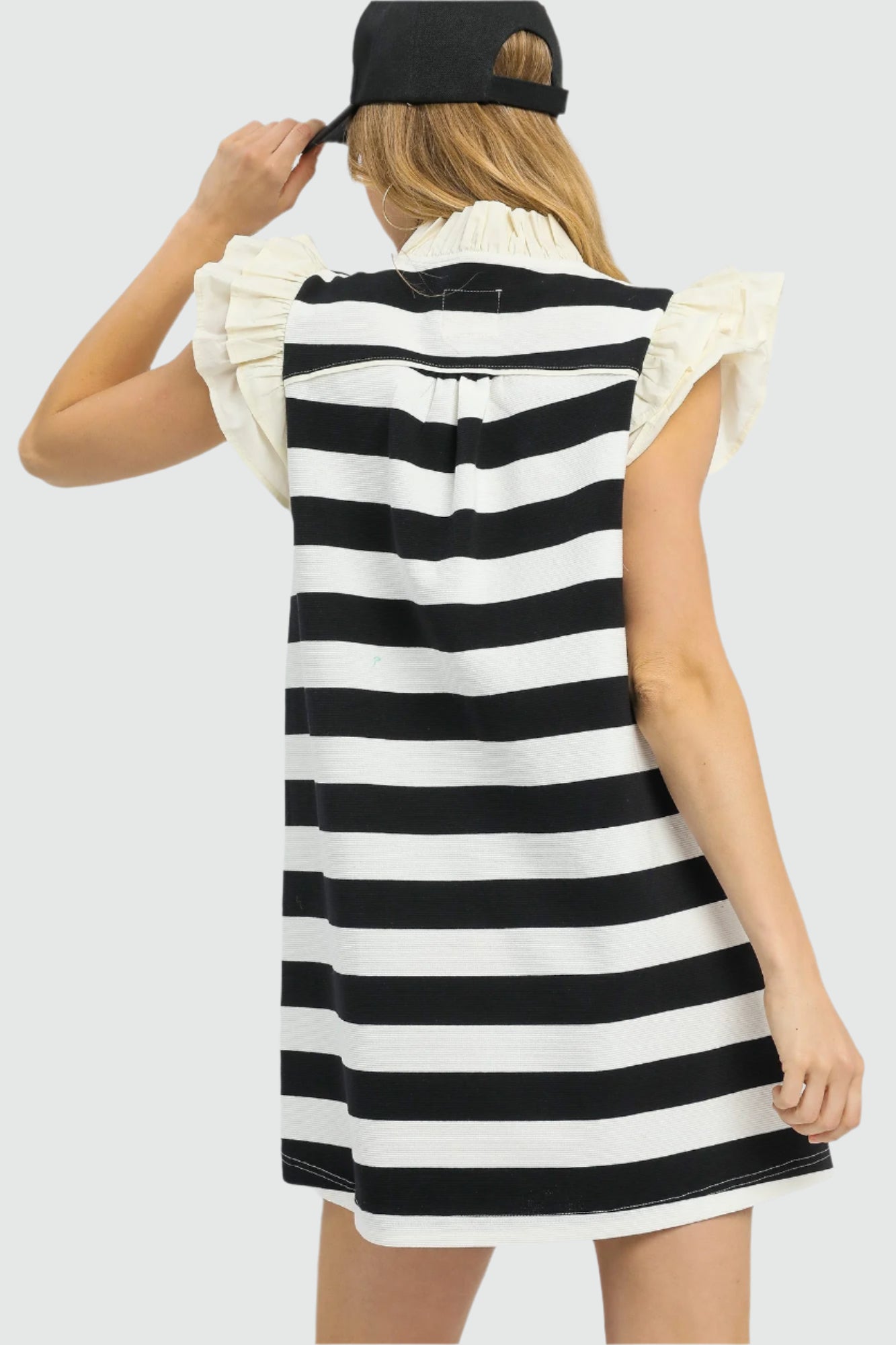 Ruffle cap sleeve, split neckline, striped mini length dress with stretchy knit fabric and a structured finish.