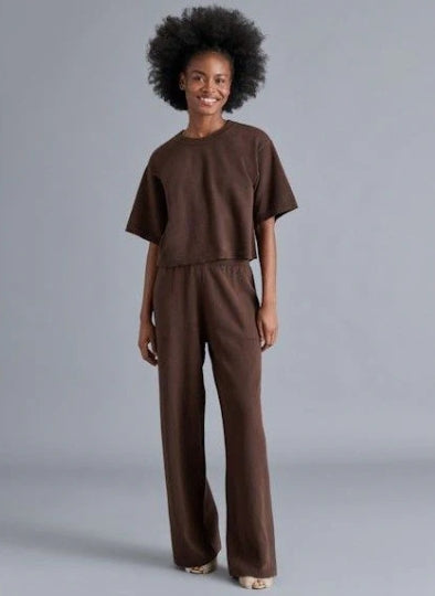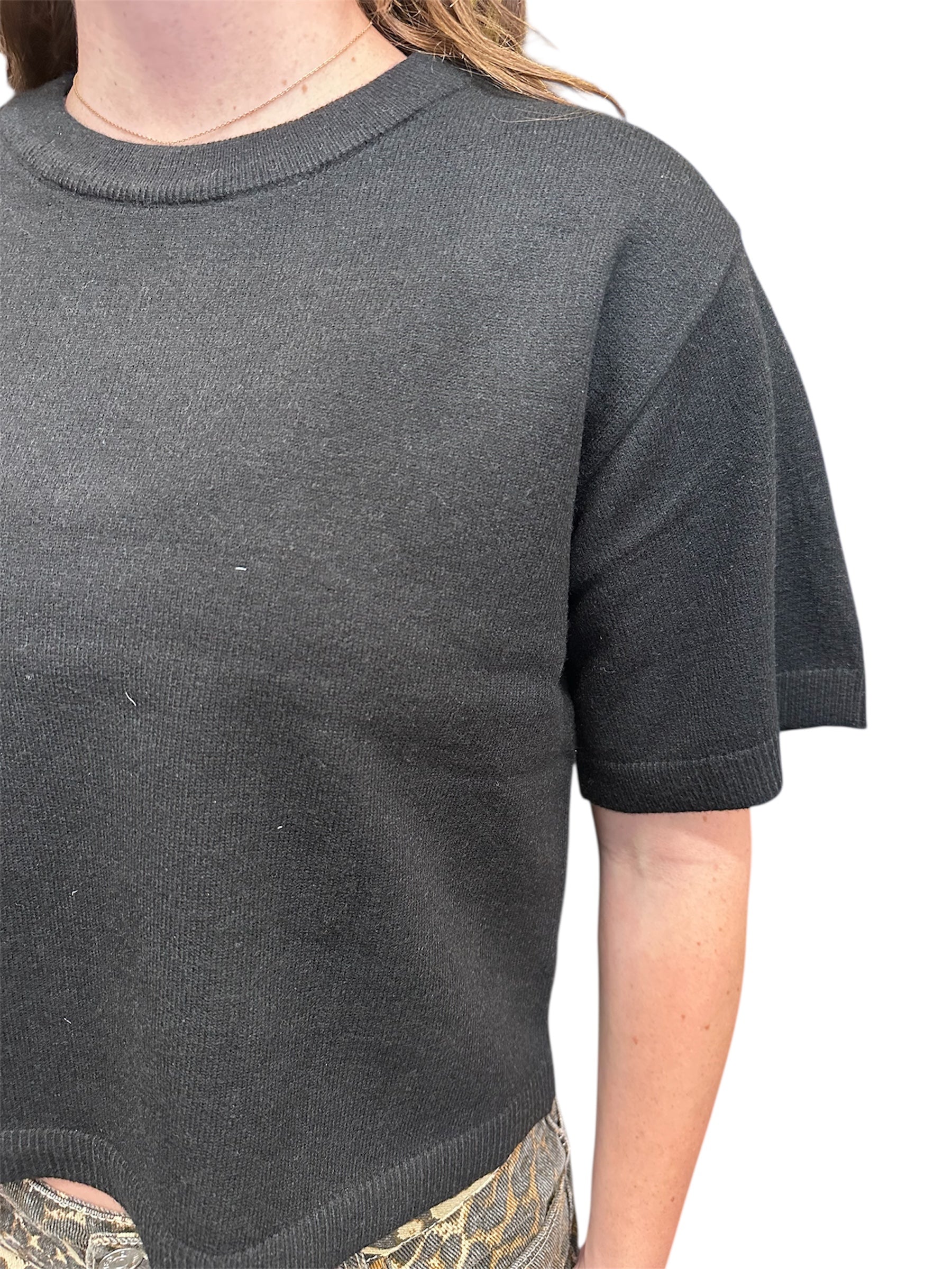 Short sleeve, crop, soft knit material sweater with a round neck.
