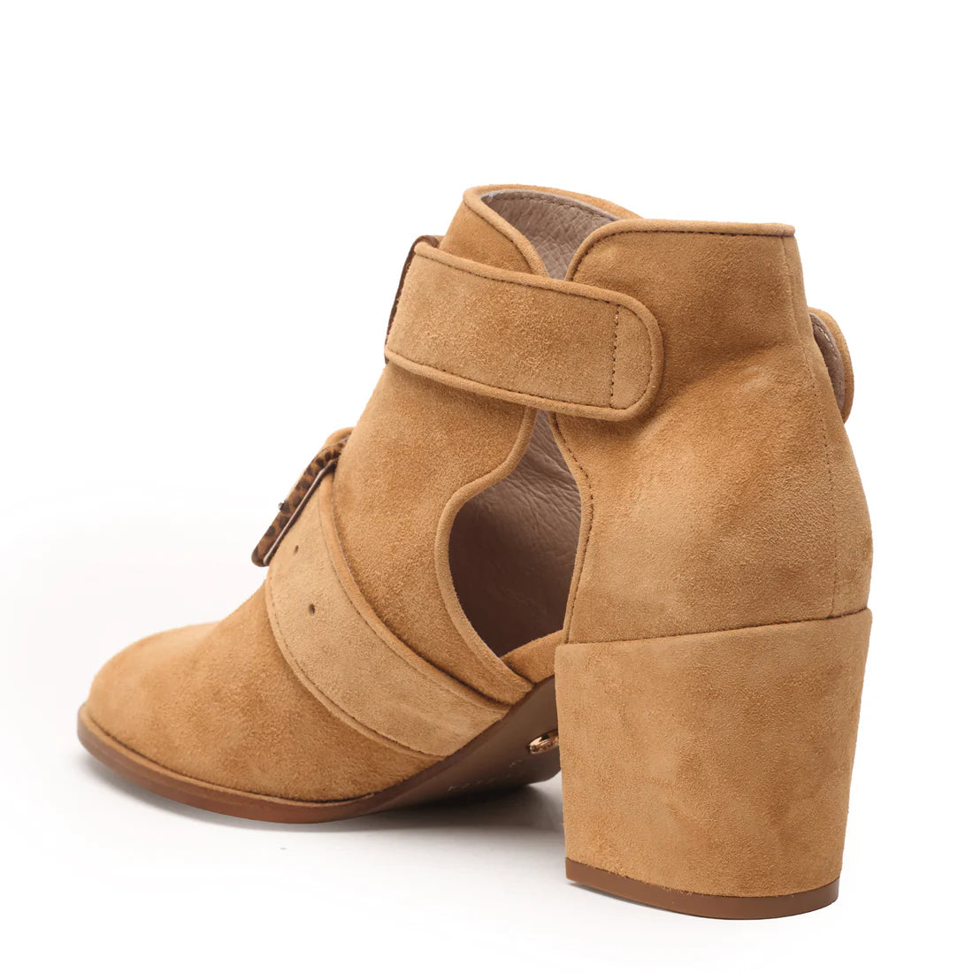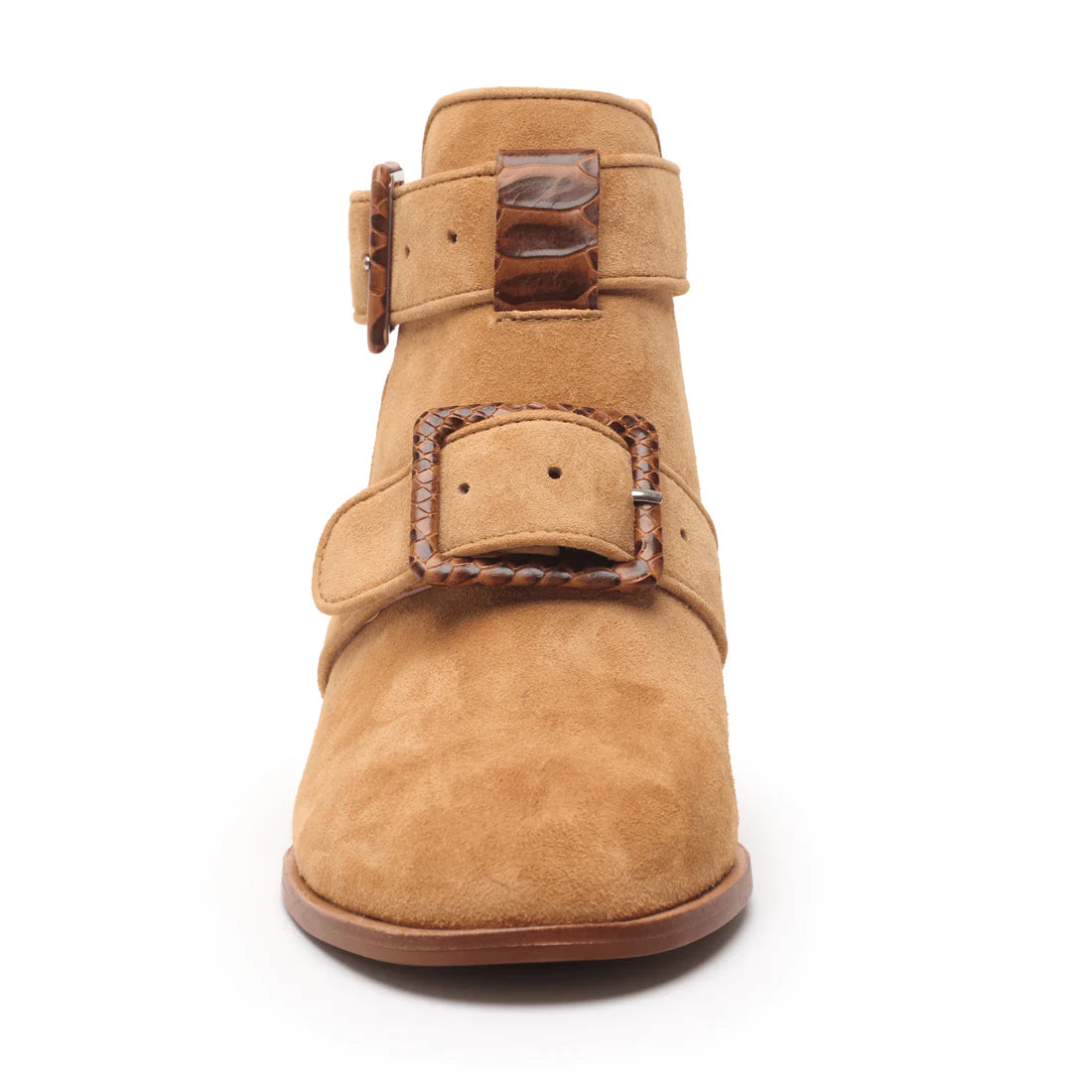 Buckle up for a fun night in this striking Suede cutout boot, highlighted by snake leather hardware and wide straps. A low block heel and a round toe make for street-chic style.