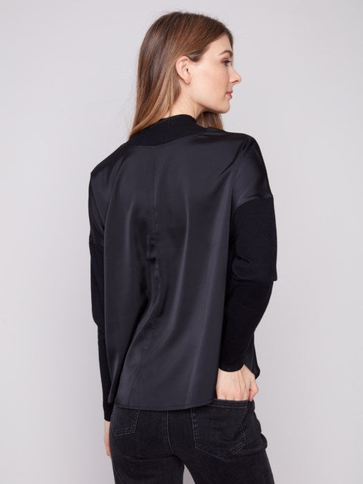 Mock-Neck Satin Knit Combo Top With Front Seam Detail And Rib Cuffs