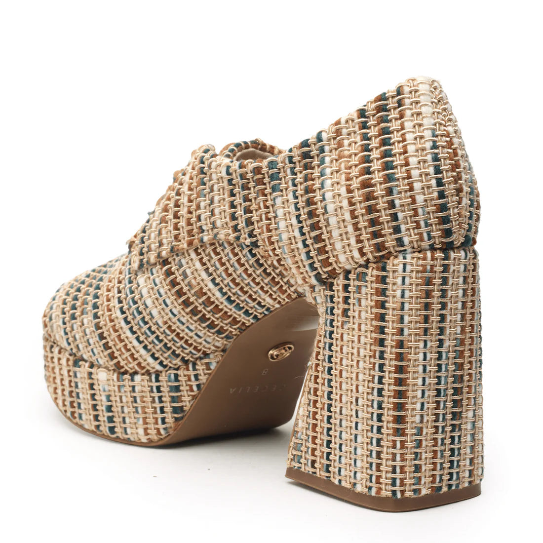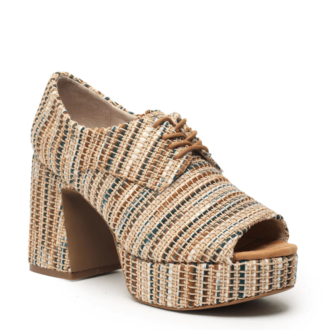 An oxford detailed and loafer-inspired topline lend modern sophistication to a peep-toe pump lifted by a chunky platform and stacked block heel.