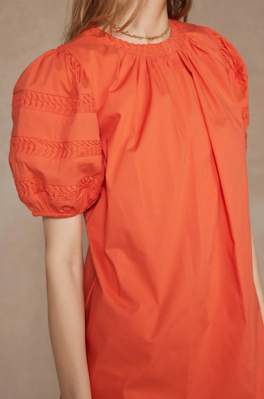 Reverse pintuck puff short sleeve mini dress in stretch cotton poplin fabric. This versatile mini dress features intricate reverse pin-tuck detail at sleeve/neck, shirred shoulders, short puff sleeve with elasticated cuff, side pockets, lining, round neck with shirring detail at front, and keyhole with button closure at back.