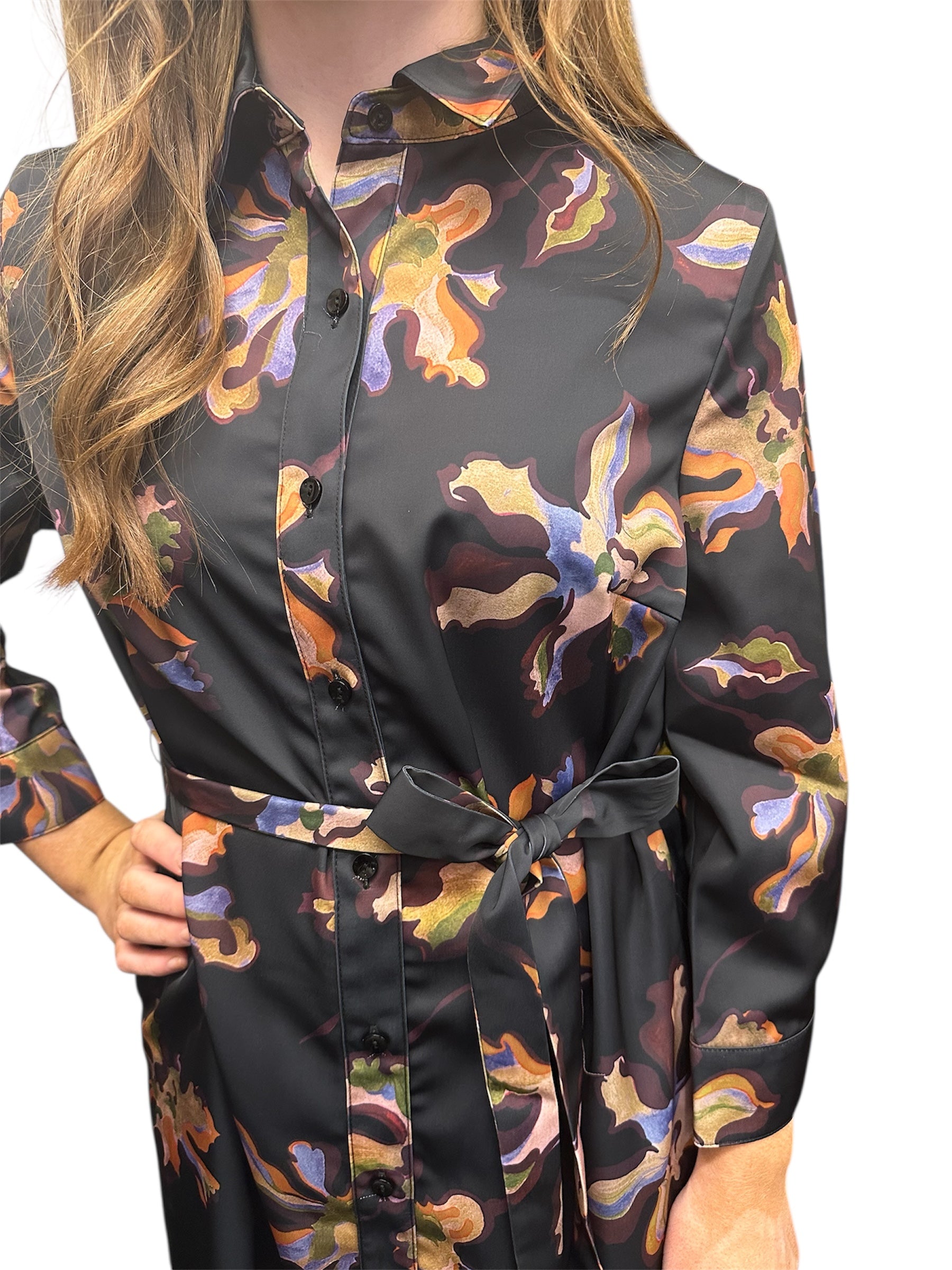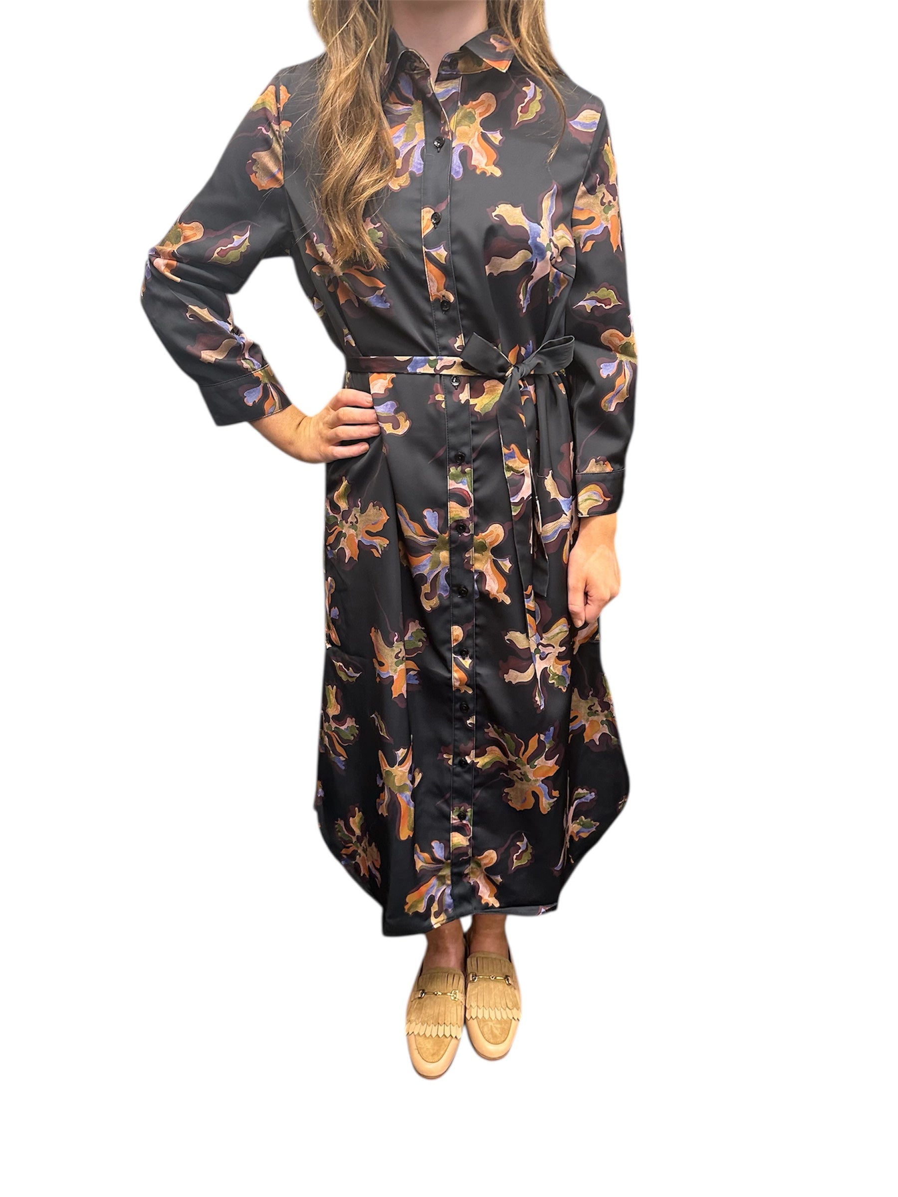Printed, collared, button front maxi dress with long sleeves and self-tie belt at the waist.
