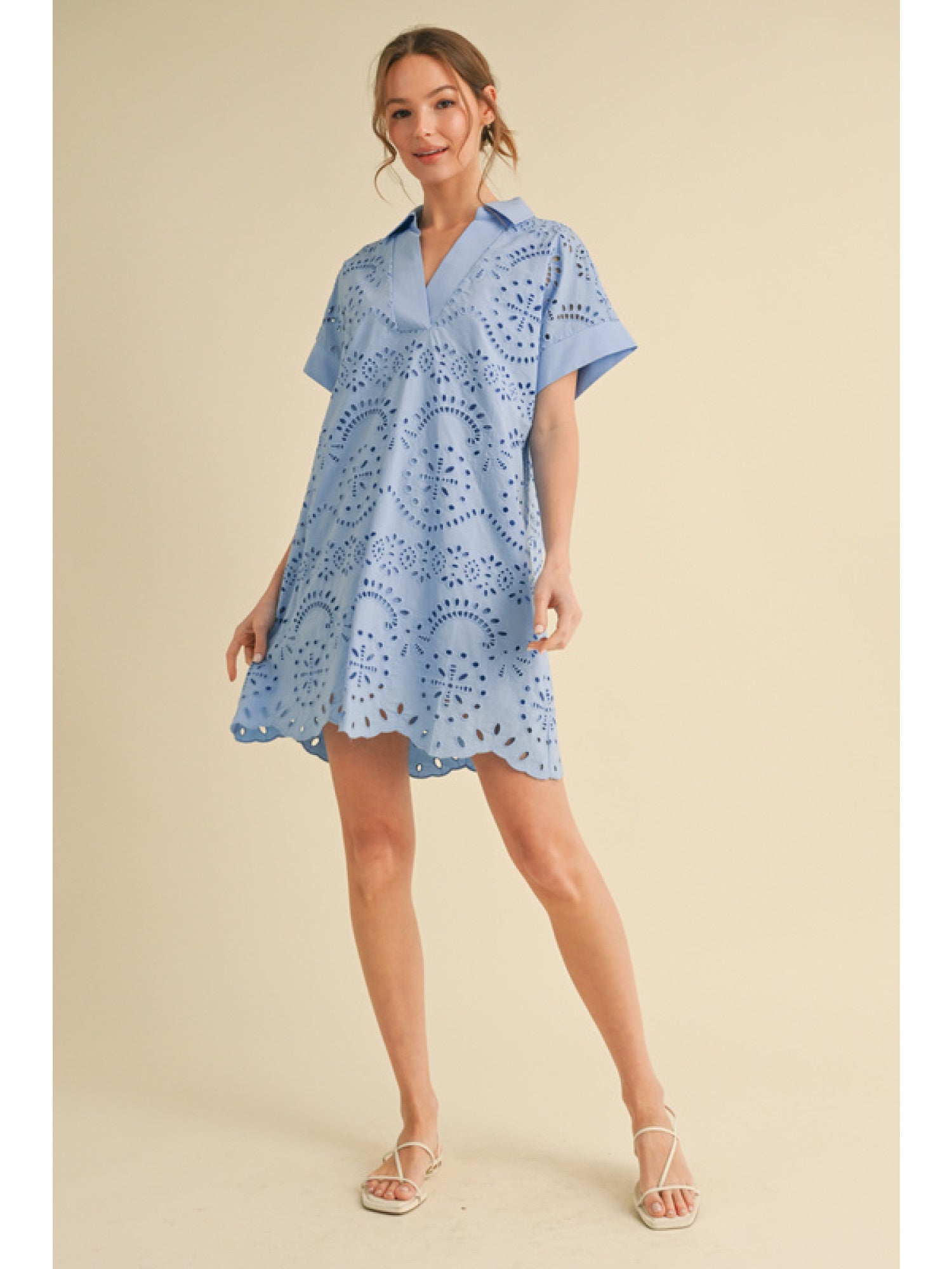 Eyelet lace dress with open collared neck, short sleeves, and scalloped hemline.