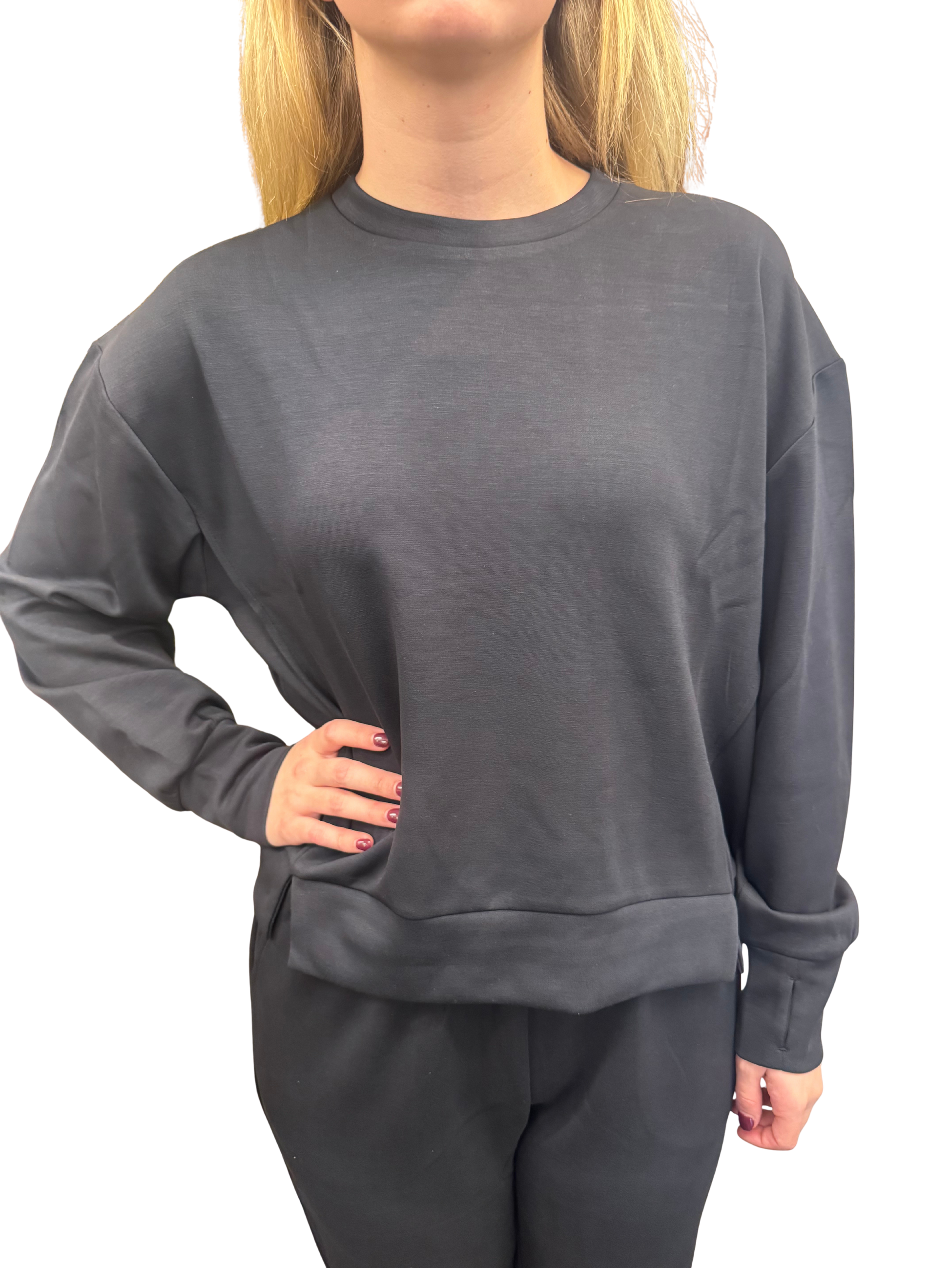 A classic crew neckline, rib cuffs and a neat hip-length hem make it the perfect athleisure layer for travel, errands or a relaxed office day. Style with our matching bottoms to create a polished lounge set.